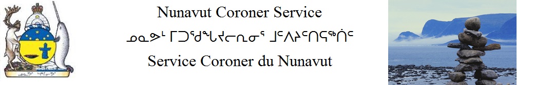 Your use of the information on this website is your responsibility. Although we strive to maintain the currency and accuracy of the information on this site, it is provided “as is”, without warranty of any kind. Neither the Government of Nunavut nor Nunavut Coroner's Office will be responsible for: